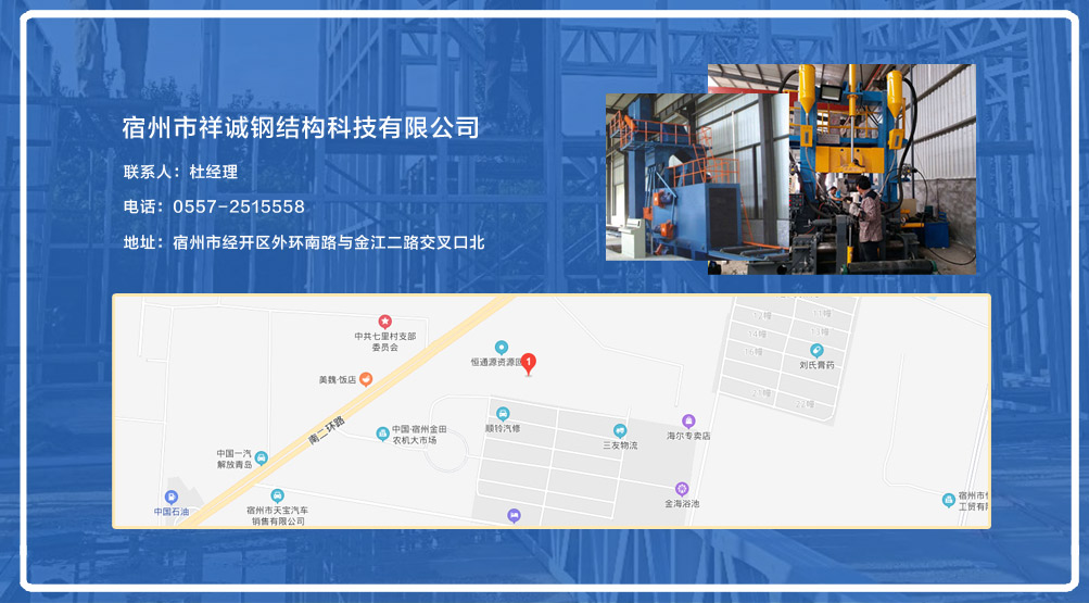 宿州市祥誠鋼結構科技有限公司位于宿州市經開區外環南路與金江二路交叉口北,公司是一家以建設產業化為目標,匯集大型鋼結構廠房、彩鋼活動房設計、制作、安裝施工一條龍服務的知名鋼結構公司。公司現有固定資產1000余萬元、流動資金近千萬元公司?,F有員工40人,大專以上學歷30人,其中高級工程師1人、工程師2人、會計師1名。各工種持證上崗率100%。高效化的年青團隊為公司帶來了蓬勃發展的動力,全體員工以務實的態度,拼搏的精神,創造著企業的每一天。      公司組織結構嚴格按現代企業制度設計,管理機構設置合理,制度完善,各部門分工明確...